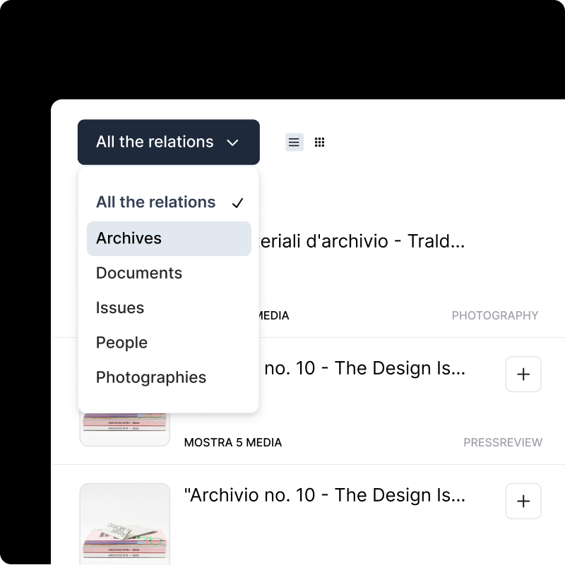 ARCHIVIO.COM does not just catalog documents or images, but preserves contexts, relationships, inspirations, and meanings. Everything that brings memory to life and shapes identity.